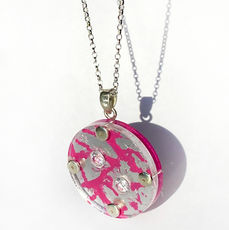This pendant is inspired by the interplay of light and reflections. It uses Silverleaf with bold colours to make a statement. It is reversablible, also being able to be worn showing with iridescent acrylic and a range of gemstones.